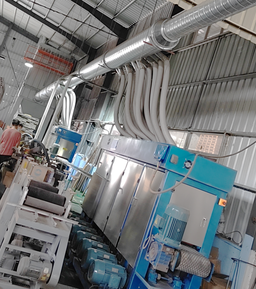 在木塑板生產(chǎn)的過(guò)程是要對(duì)其表面砂光、打磨處理,會(huì)產(chǎn)生大量的粉塵,萬(wàn)川根據(jù)場(chǎng)地與粉塵類型設(shè)計(jì)了除塵方案與一配套木塑脈沖布袋除塵器。